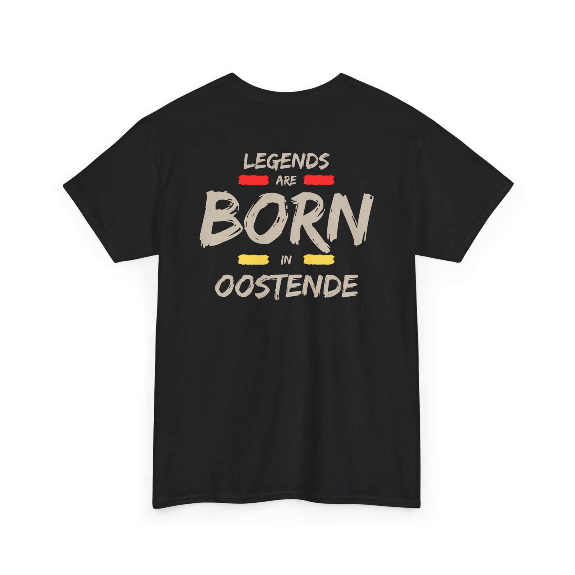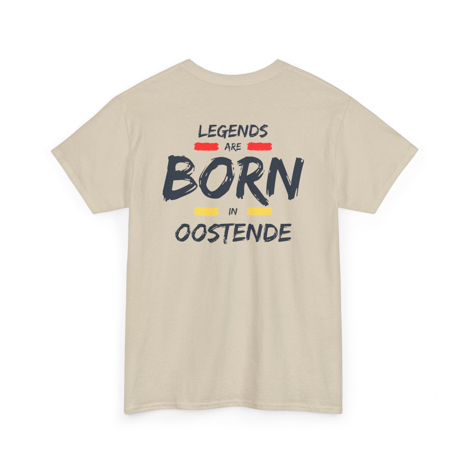 Turn up the vibe with a simple unisex heavy cotton tee that speaks legend, born in Oostende. Bold text runs down the front in rainbow-bright panels reading “legends are born in oostende” show your are proud you are born in oostende. The classic crew silhouette and medium-weight cotton give this shirt a relaxed, enduring feel — something you’ll grab when you want comfort that still looks intentional. It layers easily under a denim jacket or stands alone with shorts and sneakers. The printed inner neck and sleeve details are crisp and durable, so the design keeps its edge after many spins through the wash. Made with certified materials and responsible sourcing, this shirt balances street-ready energy with everyday practicality.